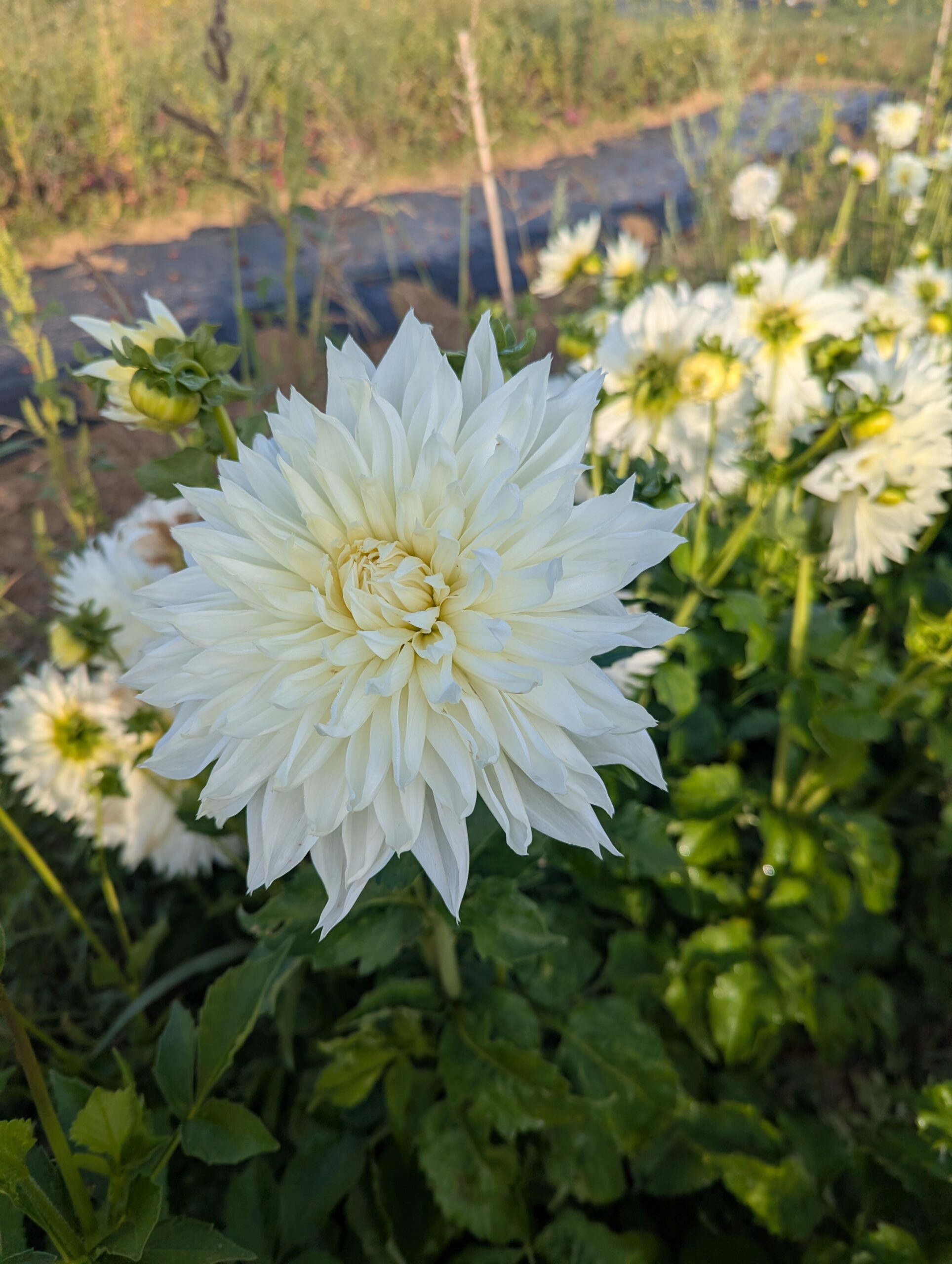 Cet opulent dahlia de très grosse taille, produit des fleurs blanches immaculées, au coeur crème.